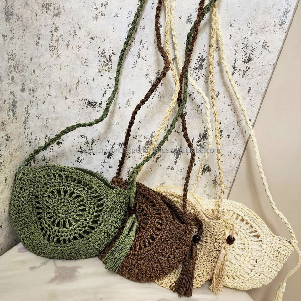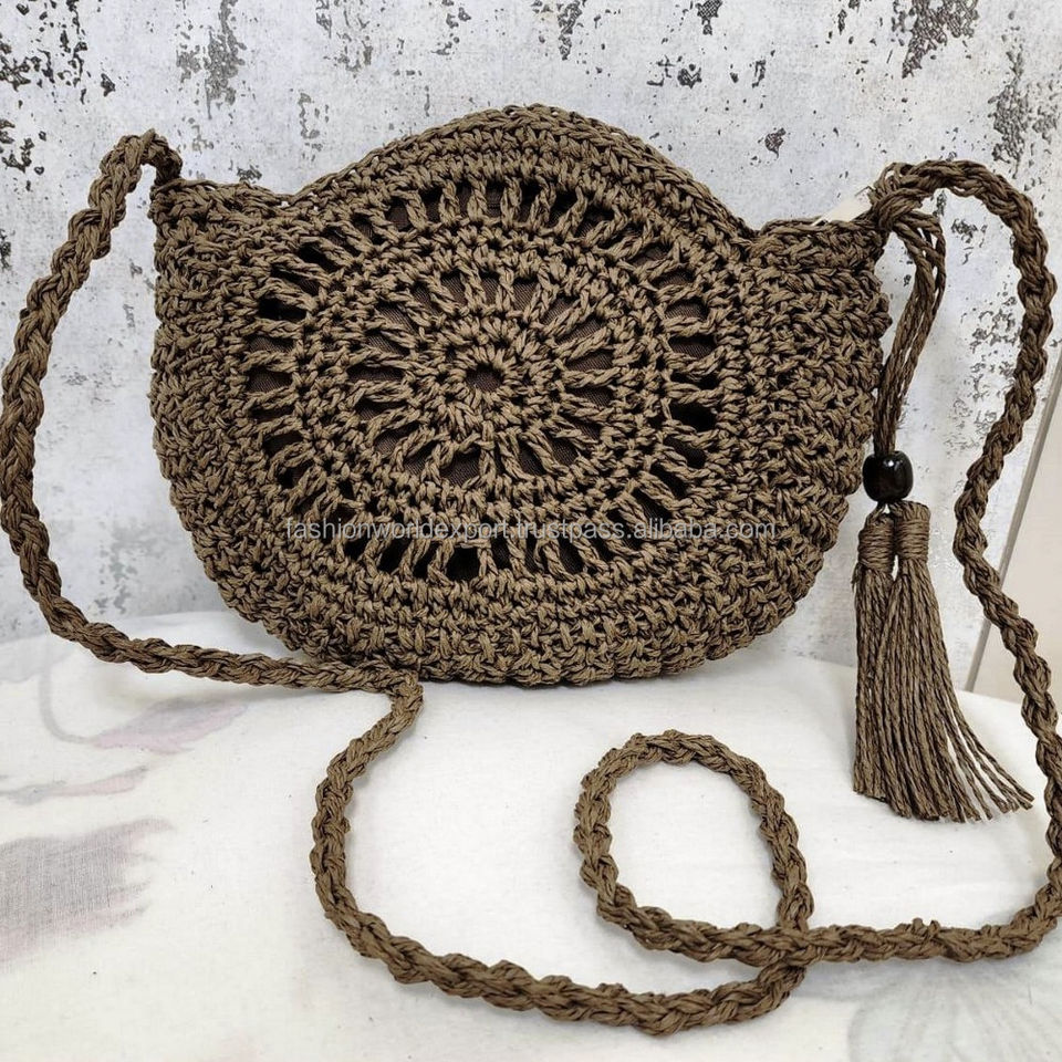 Beige Round Crochet Raffia Crossbody Bag Handmade Circular Sling Bag with Boho Tassel and Braided Strap and Beaded Charm