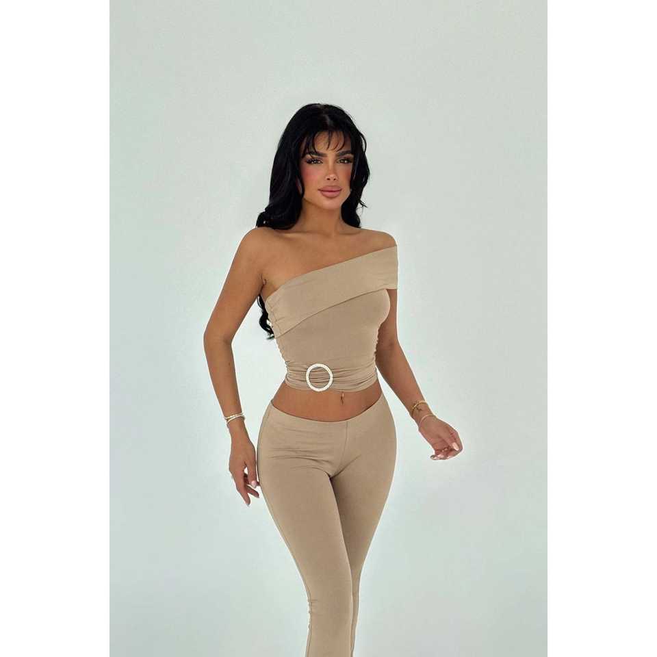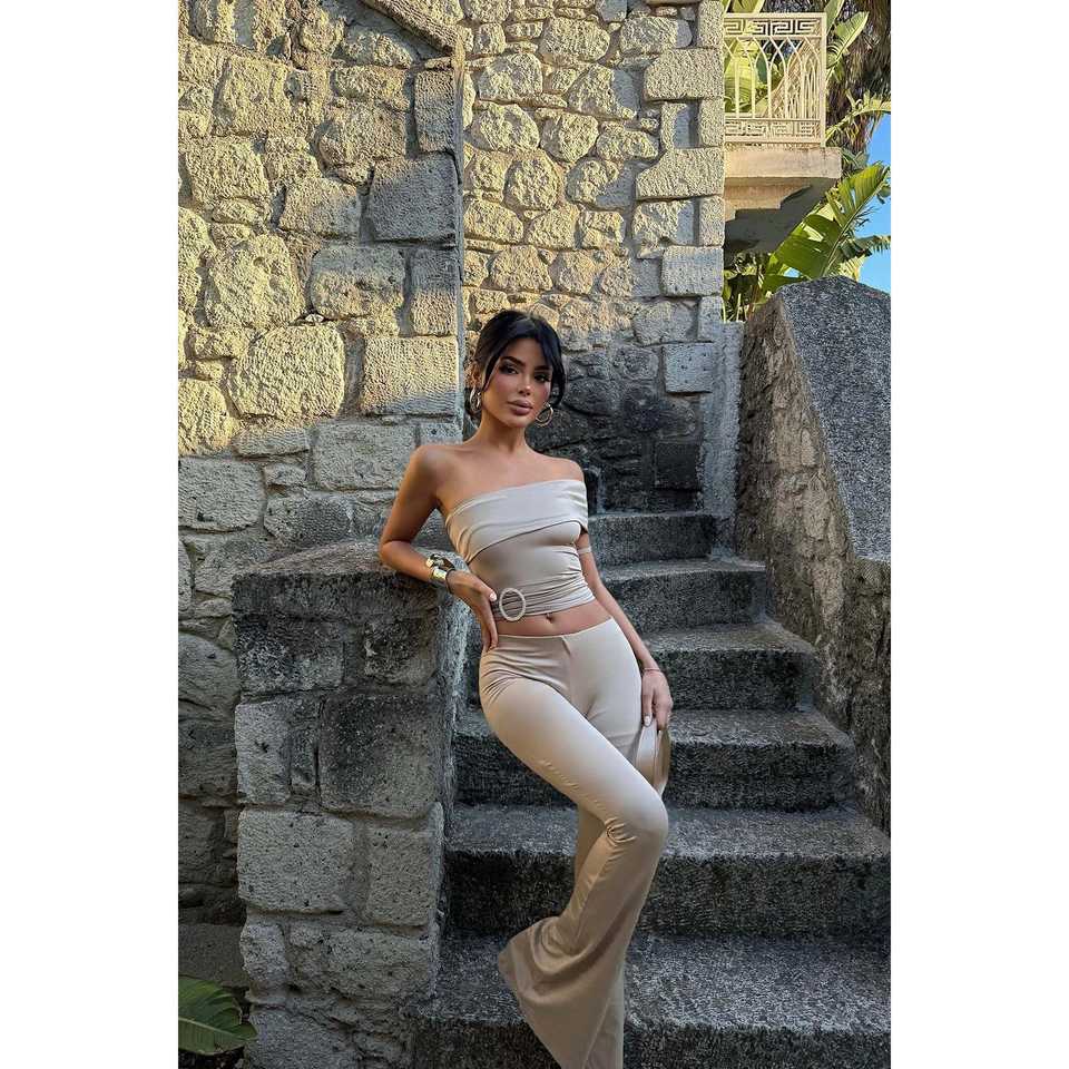 Beige Satin Trouser Suit for Office Lady Casual Pleated Design with Button Decoration for Summer