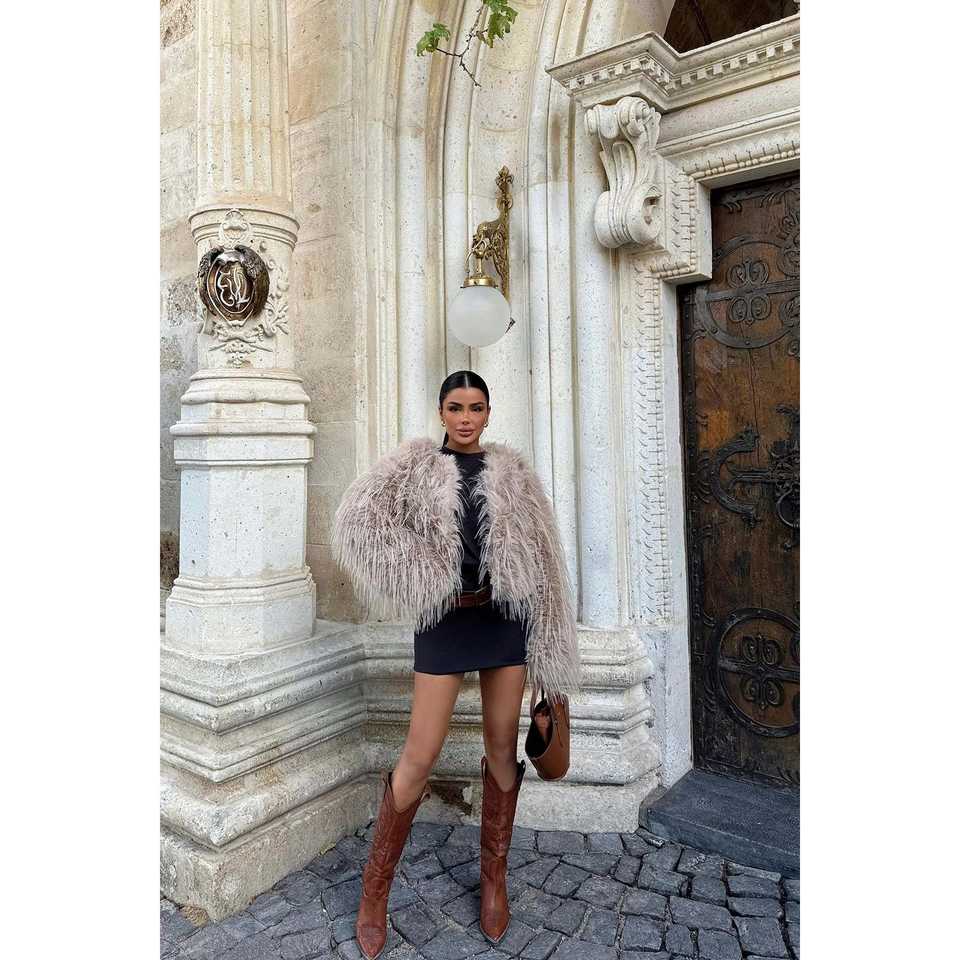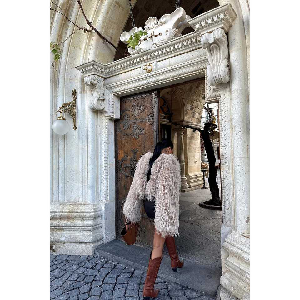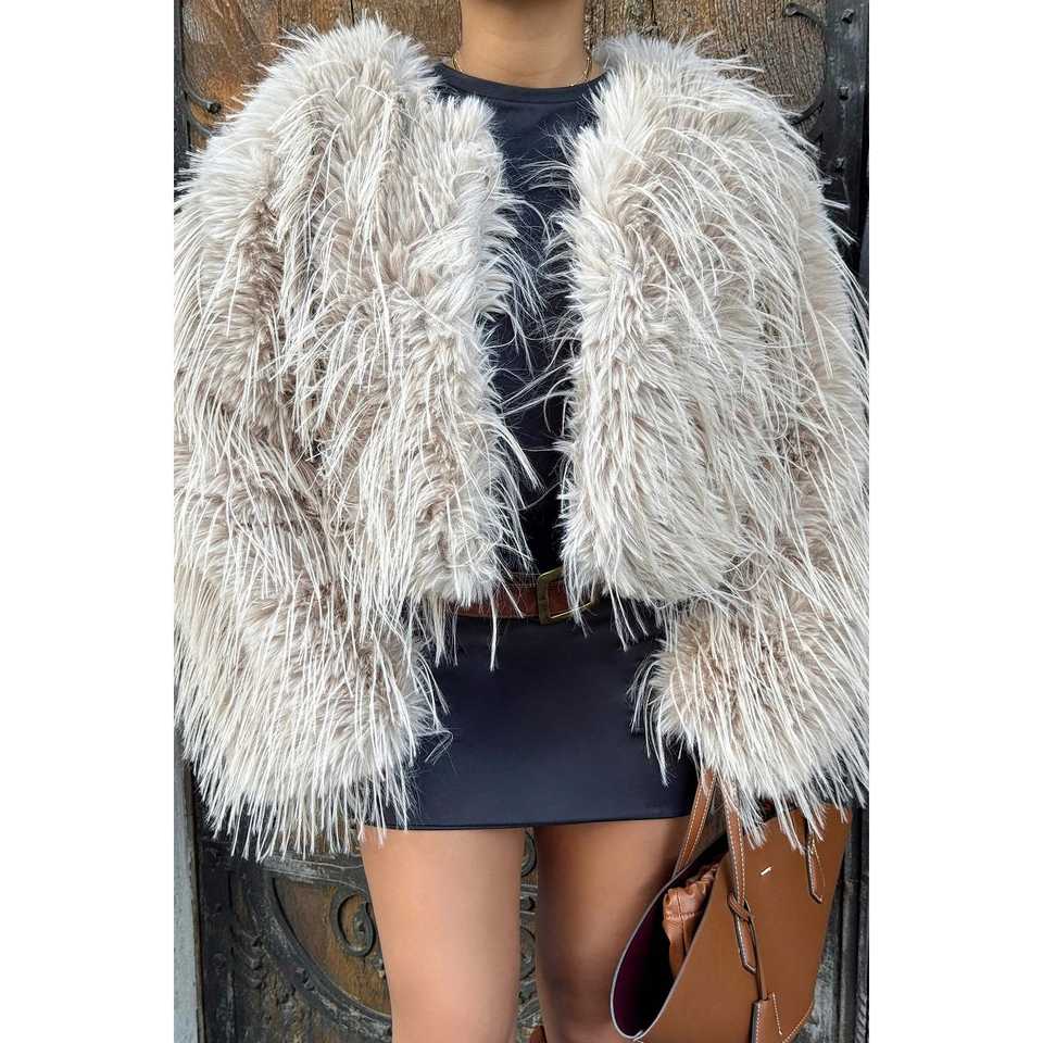 Veste courte en fourrure de renard beige avec imprimé vintage et décoration de boutons en laine et soie tissée