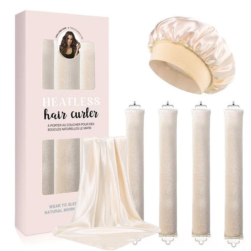 Ensemble de bigoudis en soie beige, bigoudis sans chaleur en satin, bandeau pour cheveux, bonnet pour dormir