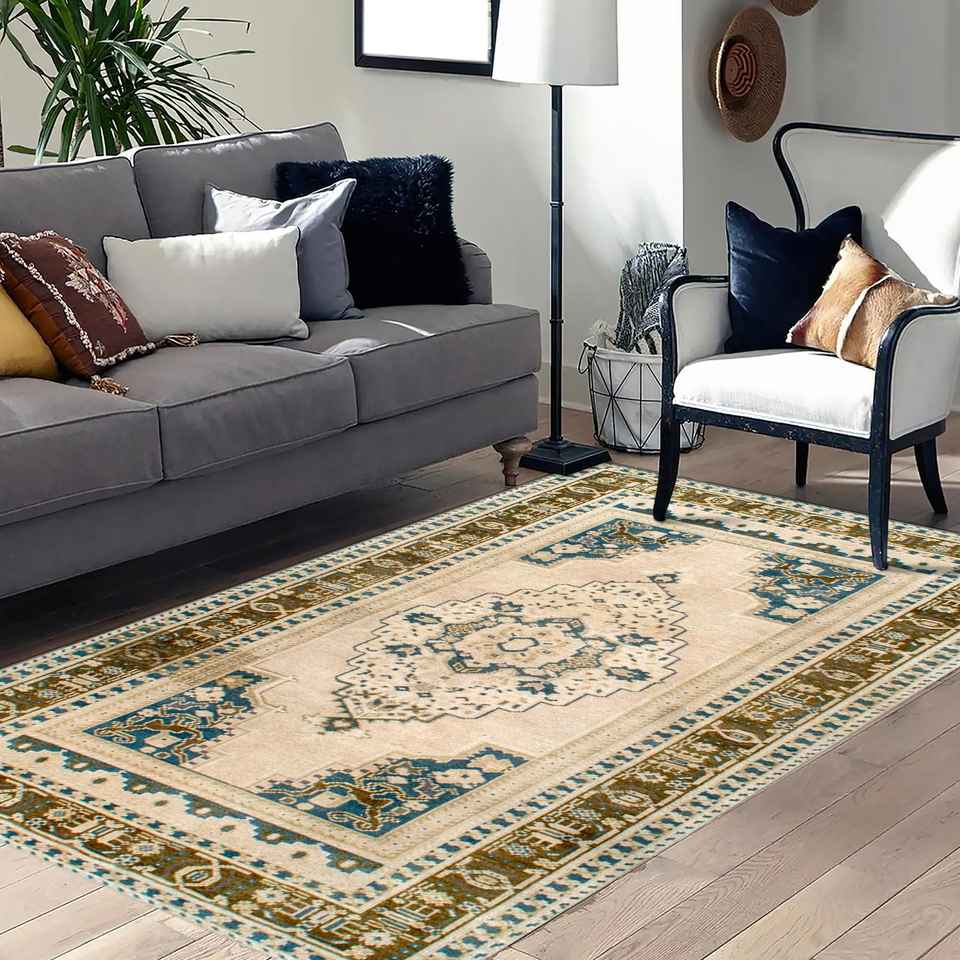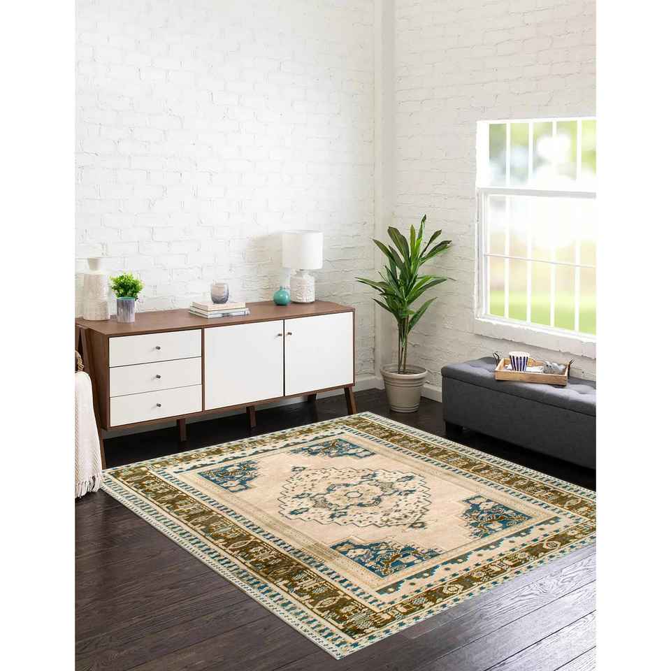 Tapis turc beige : motif géométrique à médaillons, lavable en machine, tapis imprimé, tapis à poils doux