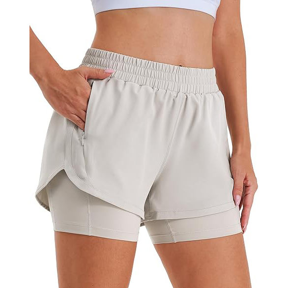 Shorts de course 2 en 1 pour femmes, couleur beige, shorts de sport fluides, polyester, séchage rapide, shorts de fitness, taille haute avec poche zippée