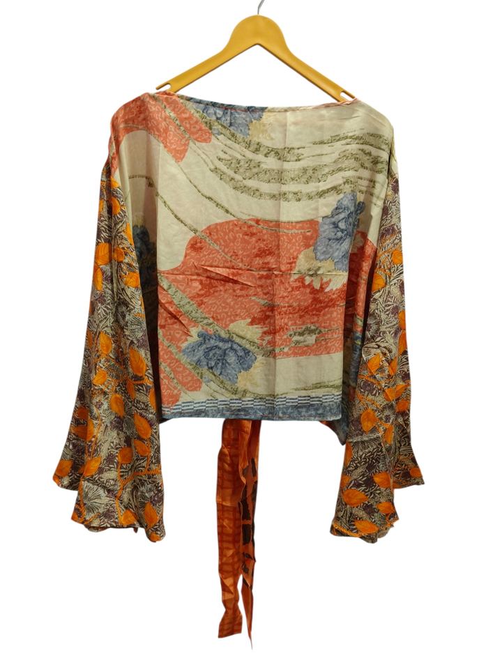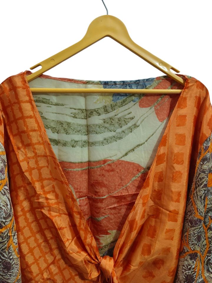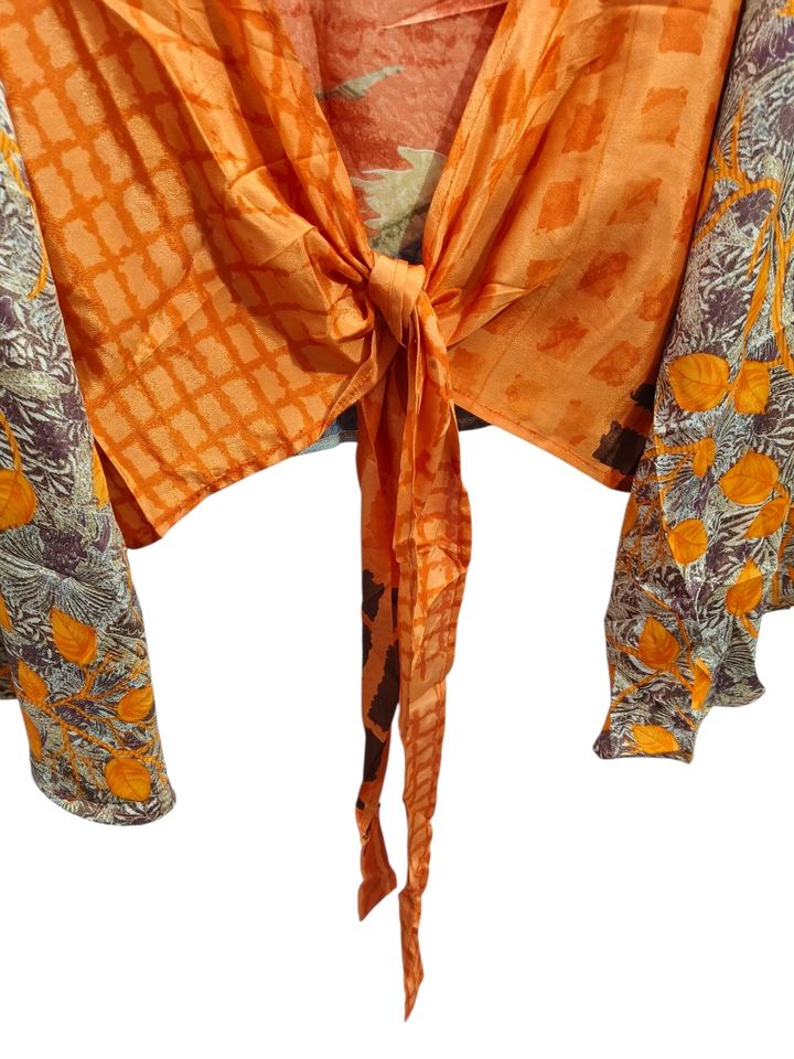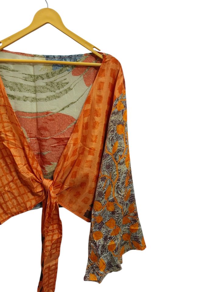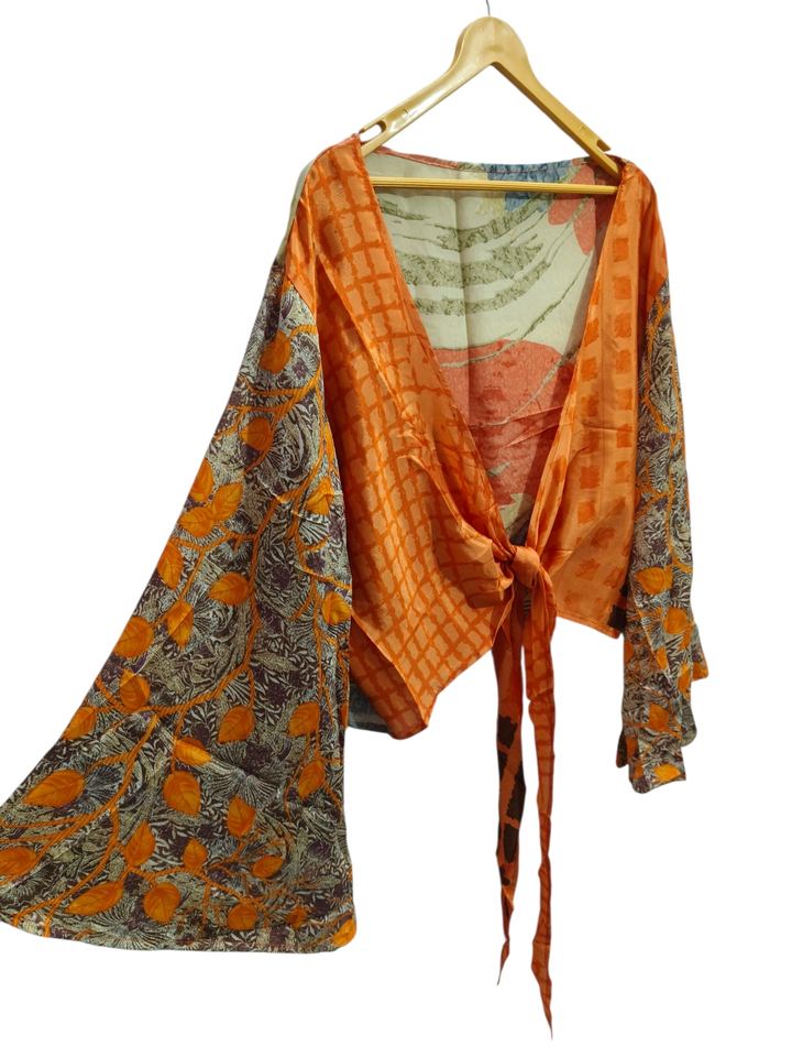 Haut court à manches cloche haut à nouer en soie, haut portefeuille indien fait à la main, haut d'été à nouer sur le devant Hippie, tunique en soie enveloppante