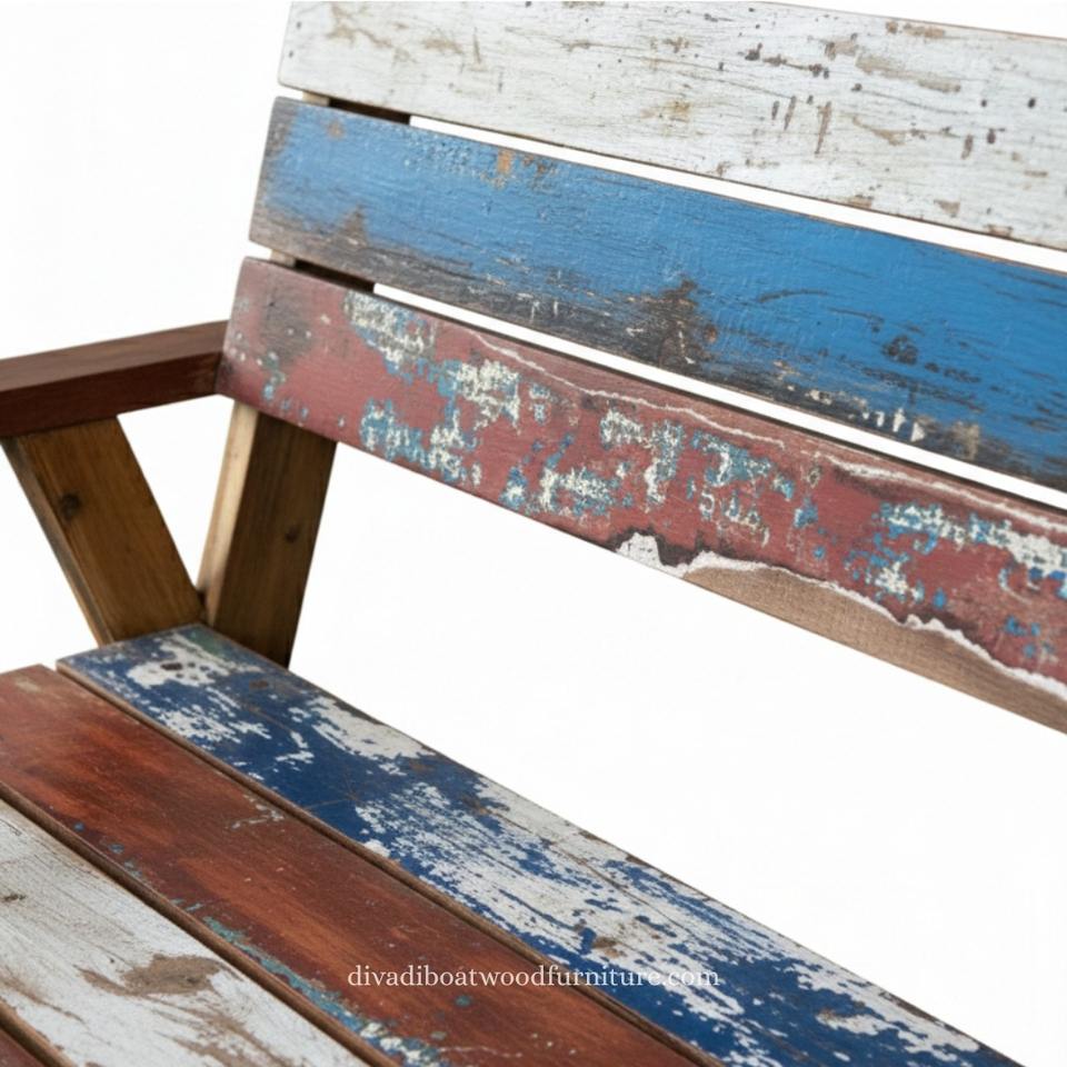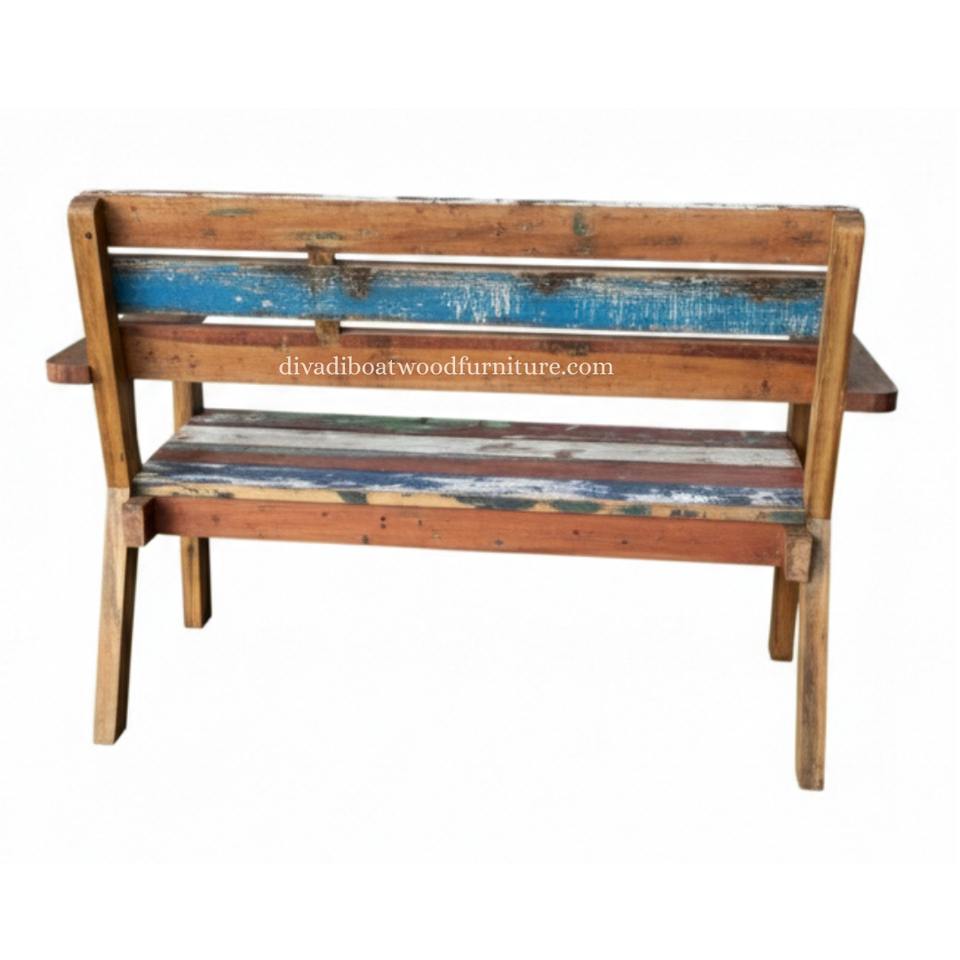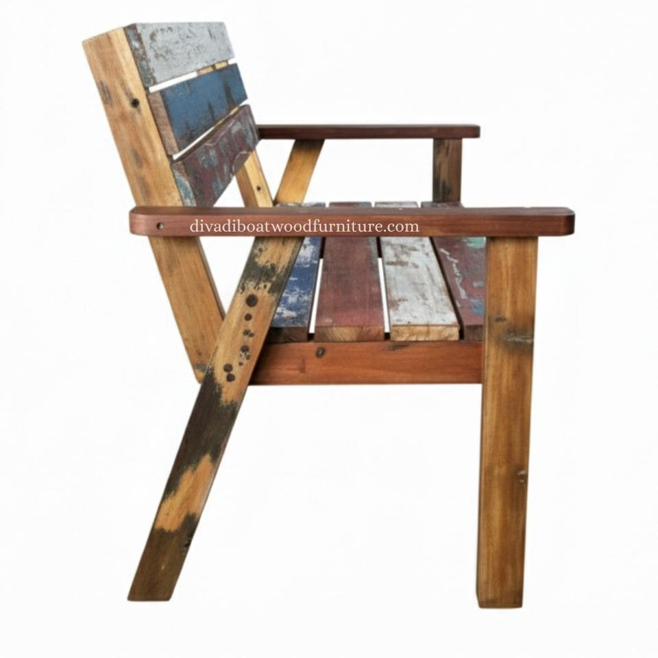 Le banc SL est équipé d'accoudoirs et de dossiers, fabriqués en bois de bateau recyclé, idéal pour s'asseoir dans le jardin et à la maison.