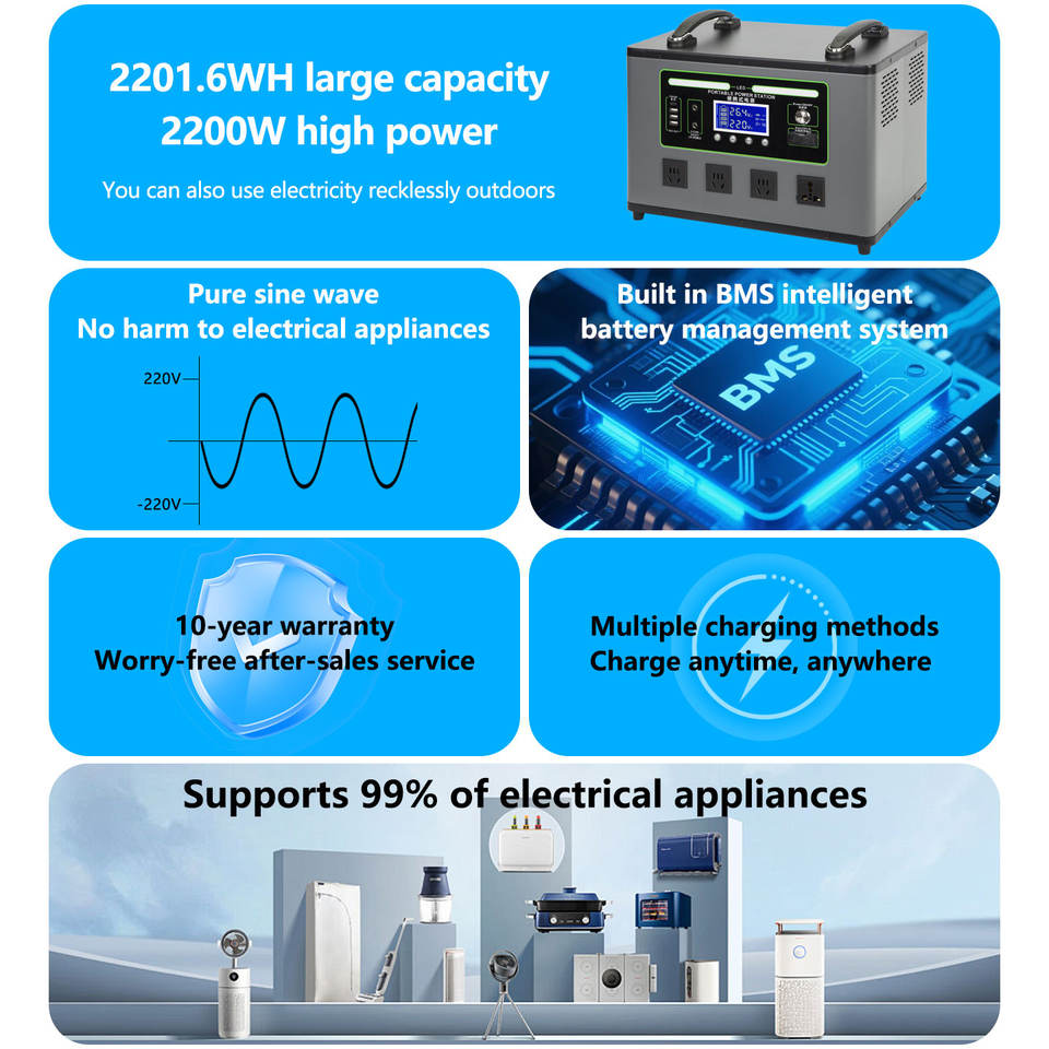 Station portable extérieure Benson 220V LiFePO4 haute capacité avec entrée solaire AC, onduleur à onde sinusoïdale pure 2KW, compatible voiture et camping