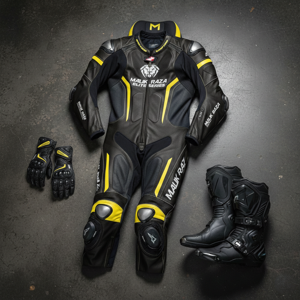 Kit de course moto sur mesure | Combinaison en cuir à haute ventilation, bottes professionnelles antidérapantes et gants de motard en cuir de vachette