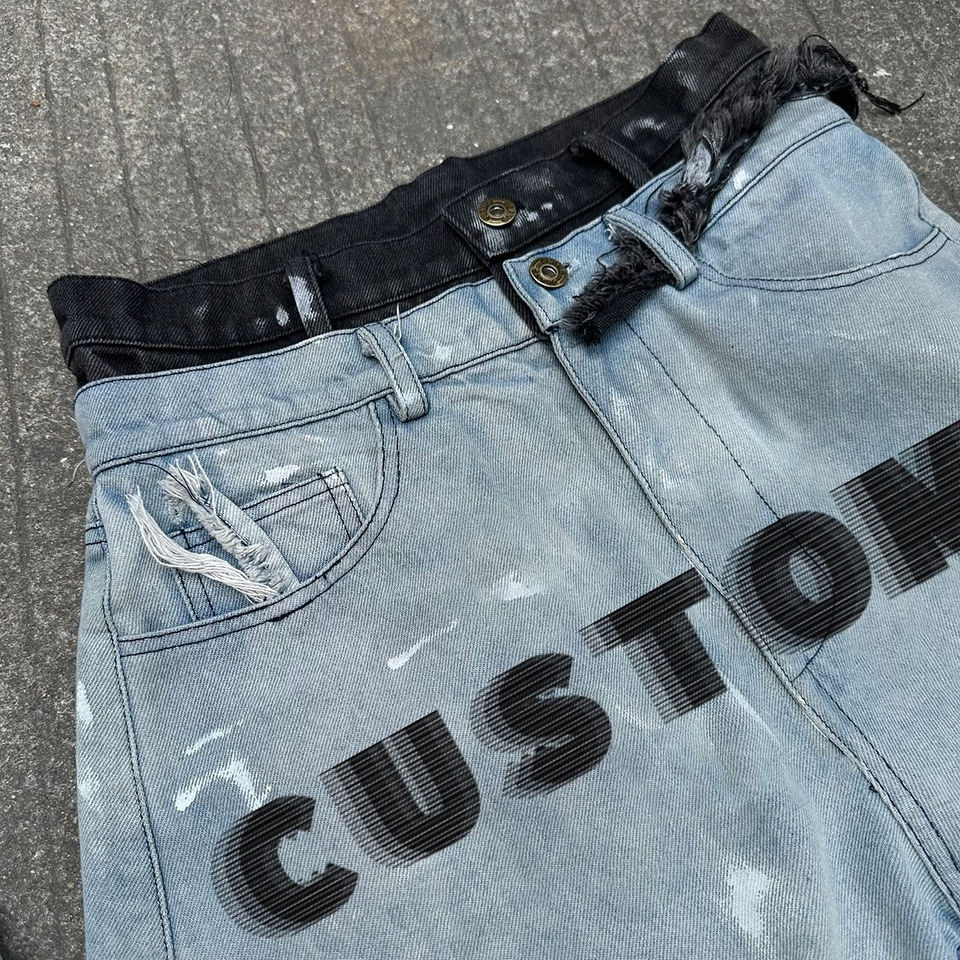 Sur Mesure Sérigraphie Vintage Lavage Déchiré Déchiré Baggy Jorts Double Taille Streetwear Denim Shorts pour Hommes