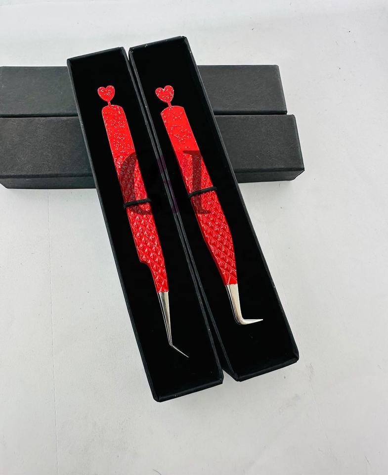 Meilleures extensions de cils en acier inoxydable, anti-magnétiques, durables, avec revêtement en poudre rouge 90 degrés, paillettes argentées, design cœur sur le côté arrière, volume bootcut