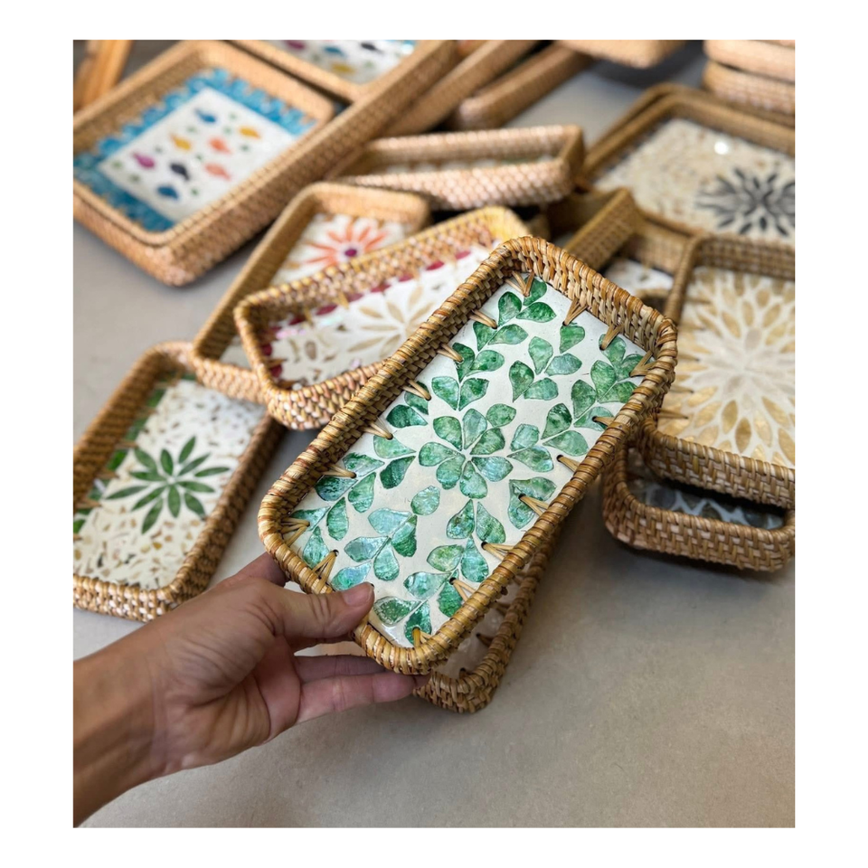 Best Choice Mother of Pearl Rattan Tray Round Shaped with MOP Handicraft Rattan Wicker