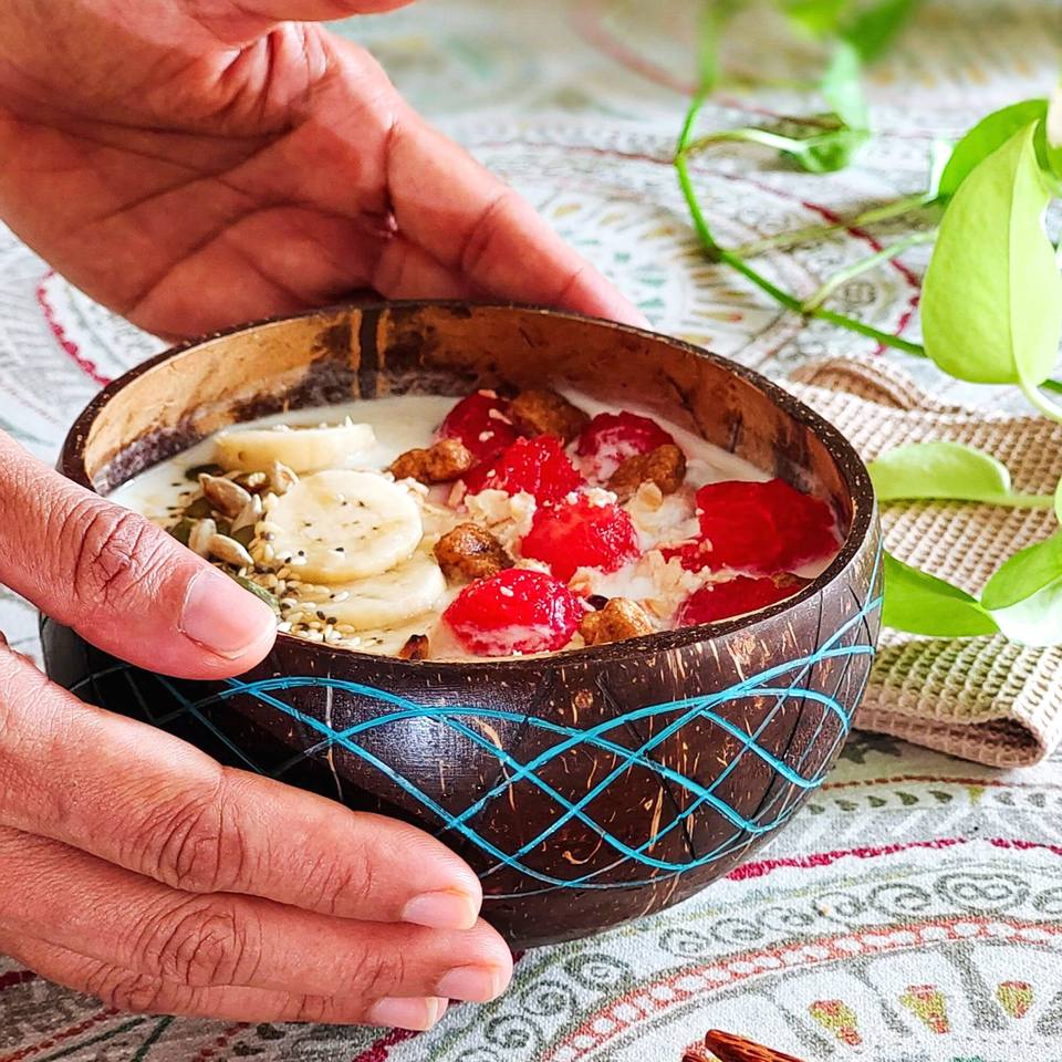 Meilleur choix pour le camping d'été Bol à smoothie jetable écologique en bois de noix de coco Motif de vague bleue Plateau sculpté sans danger pour les aliments