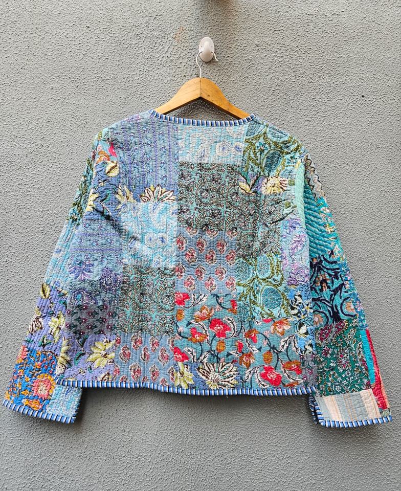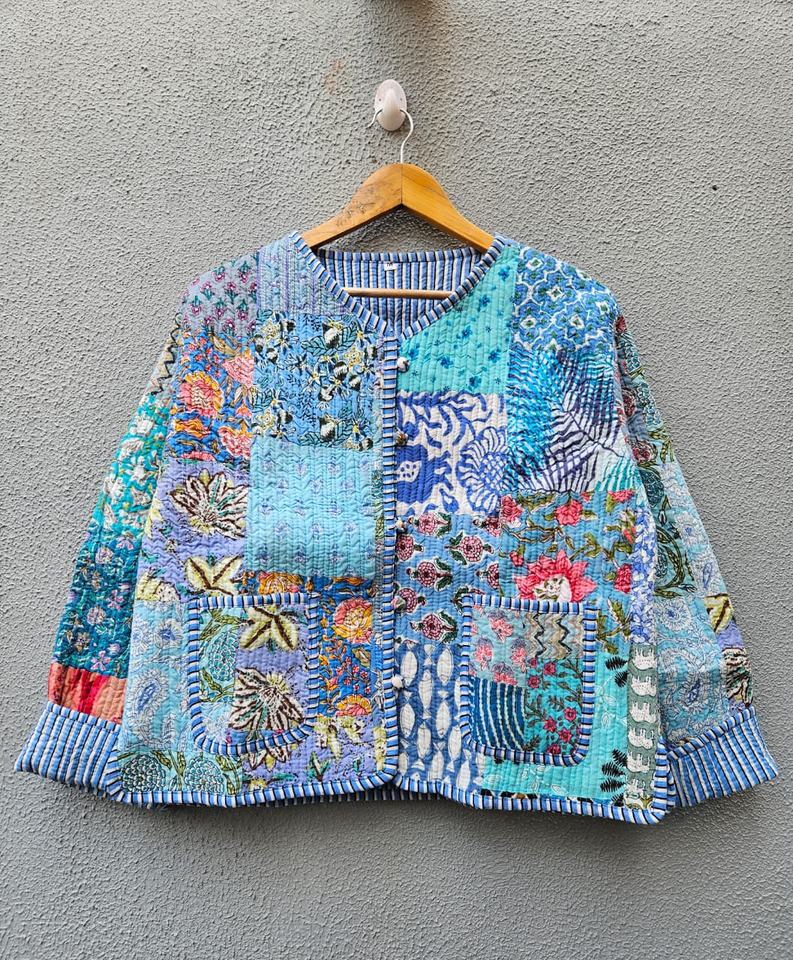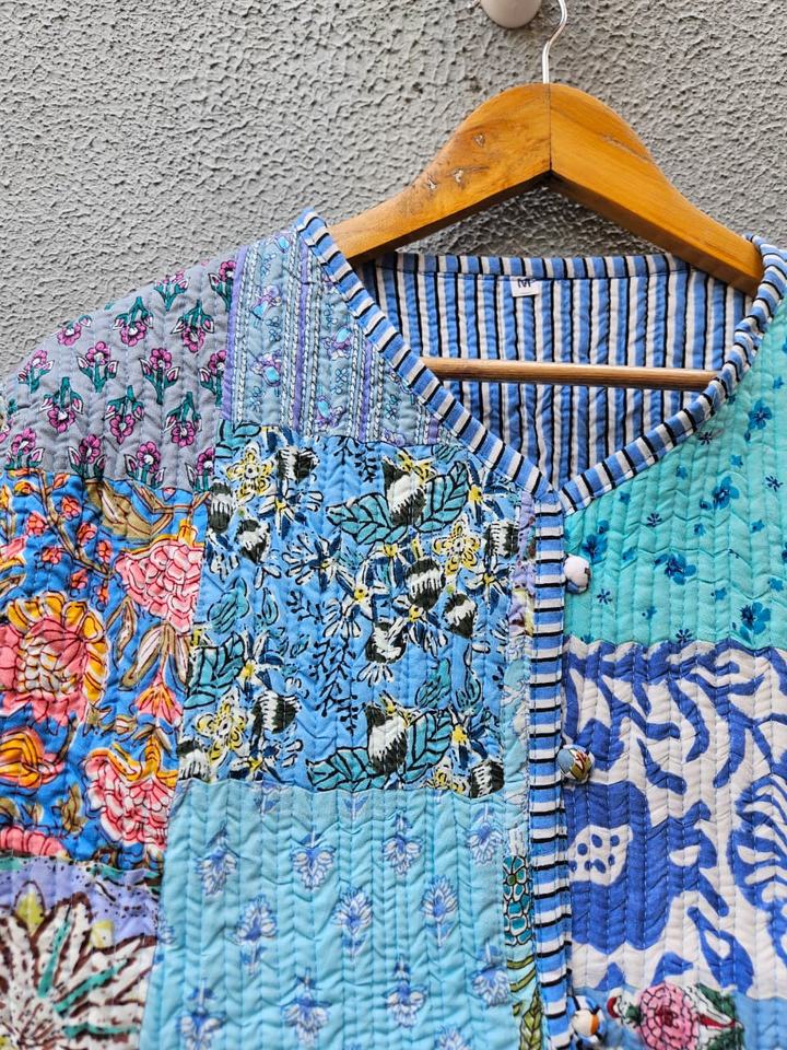 Manteau matelassé léger en coton imprimé à la main motif floral bleu, style ethnique avec boutons sur le devant pour femme – Le meilleur choix pour un look élégant