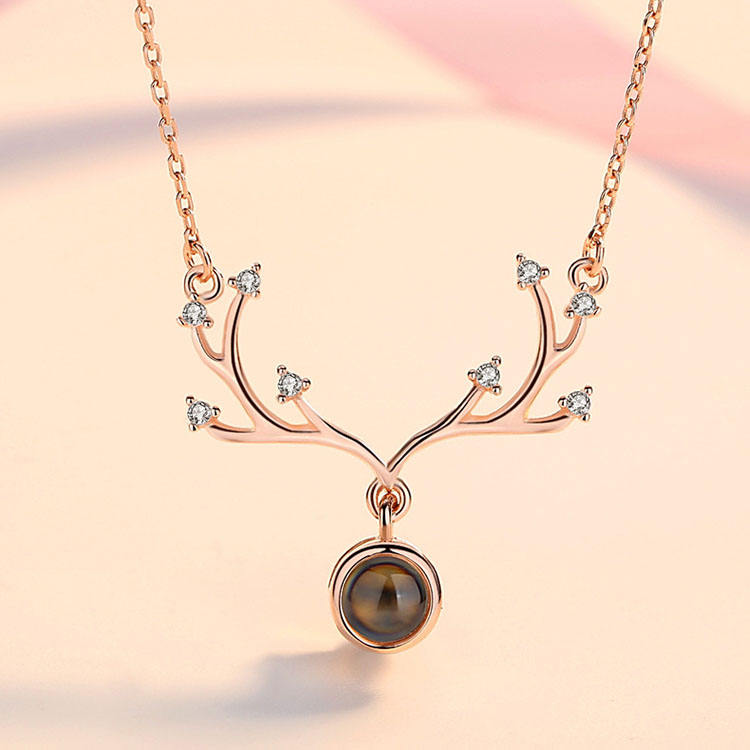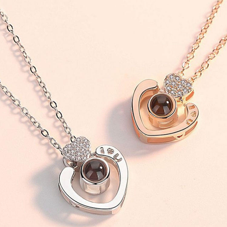 Meilleur Cadeau Nouvelle Tendance Collier Projection Mémoire d'Amour en Cuivre Plaqué Or Rose avec Zircon en Forme de Cœur 'Je t'aime' en 100 Langues