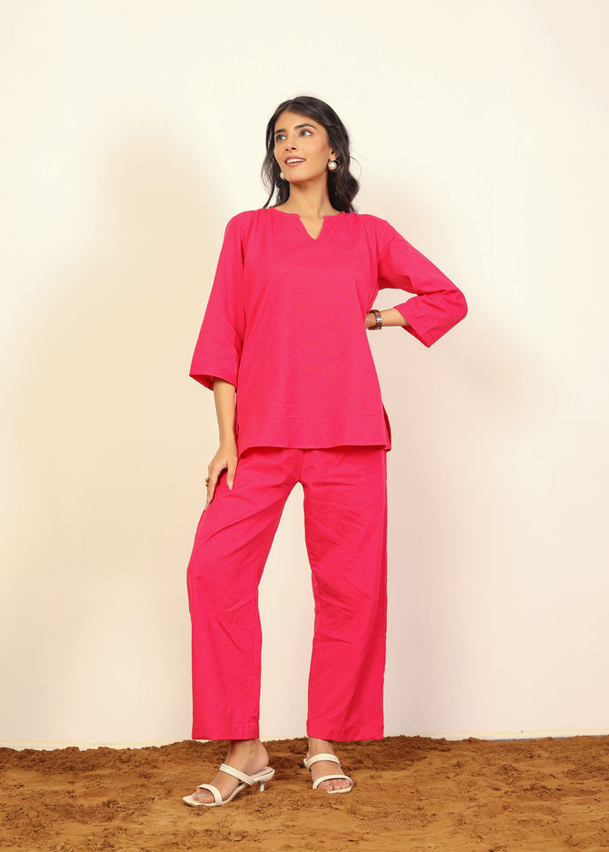 Meilleur ensemble deux pièces en lin rose Indo Western Co-ord Kurta Style haut pantalon à jambes larges coton lin mélangé Style doux naturel
