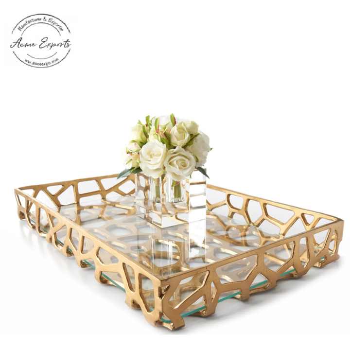 Plateau de service décoratif en métal fait à la main avec finition dorée utilisé pour la décoration de la maison et le service