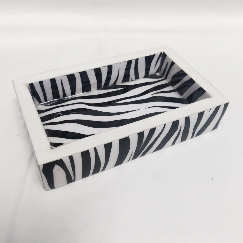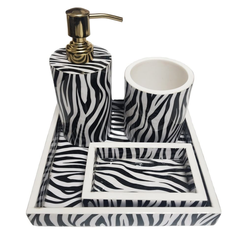 Élégant ensemble de salle de bain 4 pièces à imprimé léopard monochrome avec distributeur de savon, plateau de gobelet et porte-savon en résine élégante en noir et blanc