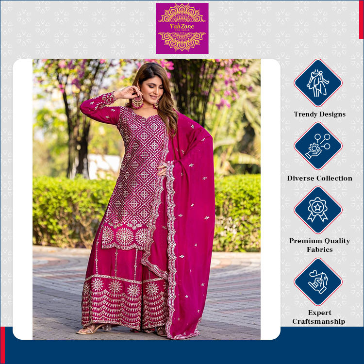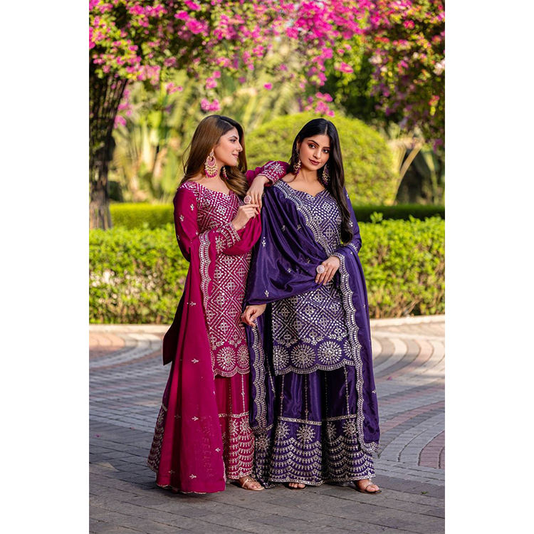 Meilleur prix pour High Nouvel ensemble de vêtements de fête traditionnels de créateur-High Chinon Kurti Plazzo Dupatta pour femme Dernière arrivée en stock