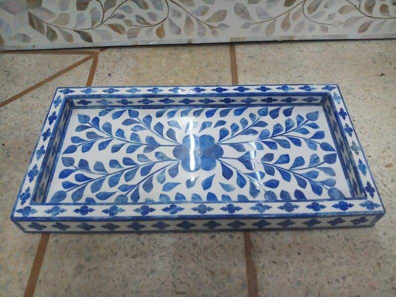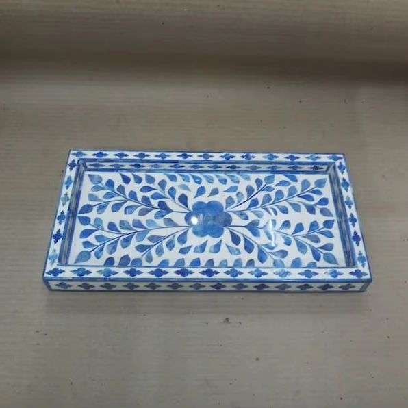 Plateau de service en incrustation d'os de meilleure qualité pour un usage domestique Plateau en bois de taille personnalisée avec incrustation de verre en marbre fourni par le fabricant indien