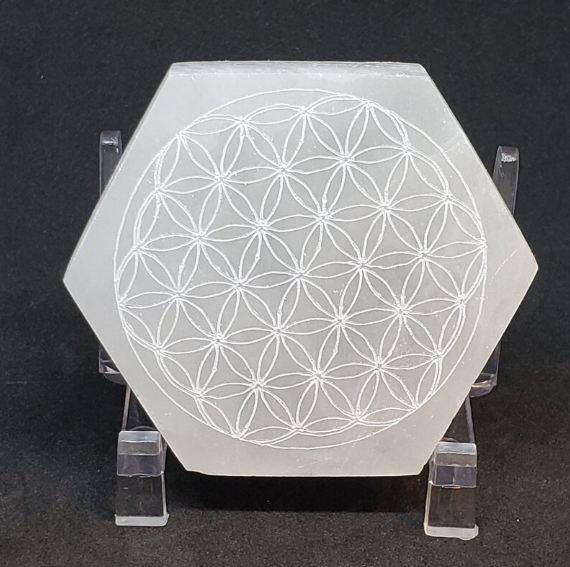 Plaque de chargement en sélénite-gravée au laser, fleur de vie