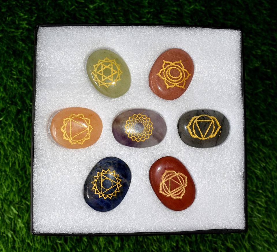 Meilleure qualité Offre Spéciale naturel 7 Chakra palmier pierre ensemble naturel poli ovale poche pierres précieuses dans cristal grille conseil boîte en bois