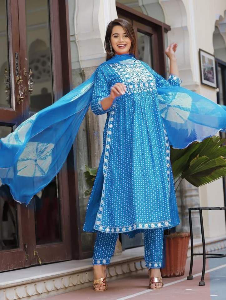 Best Quality New Modern Design Pure Rayon Embroidery Work Naira Cut Kurti Pant With Dupatta at Wholesale Rate Women Fashion