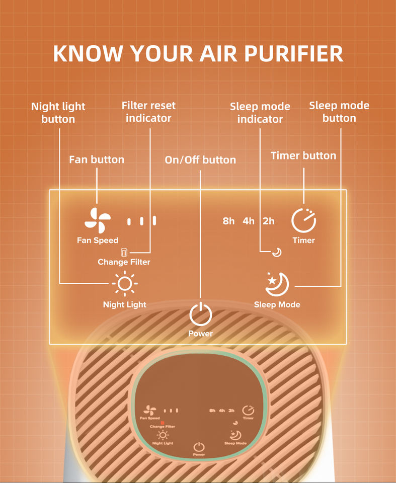 fonction:Minuterie 2/4/8 H Indicateur de qualité de l'air Rappel de changement de filtre Veilleuse