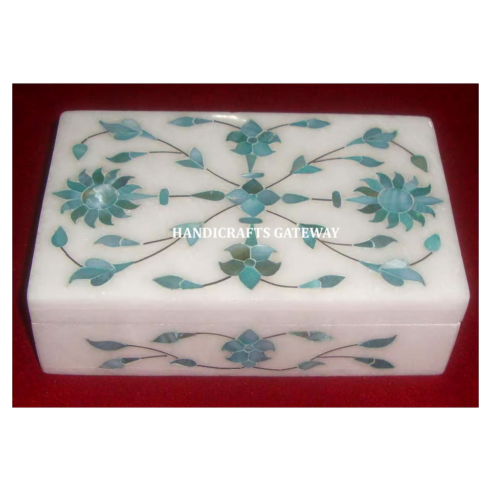 Meilleure qualité pur blanc marbre vert nacre incrustation forme rectangulaire boîte à bijoux pour cadeau d'entreprise et décoration de la maison