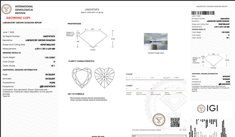 Meilleure qualité VVS1 Lab créé diamants en vrac remplis IGI certifié coeur coupe 1.33 CT D couleur CVD cultivé