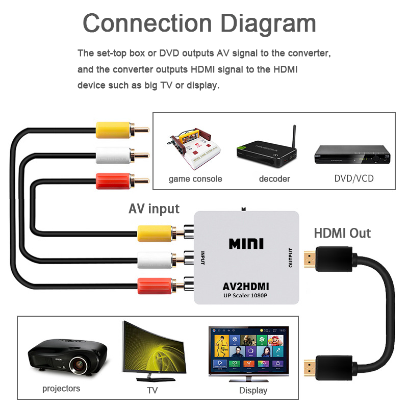 Meilleures ventes Rca vers HDMI HDTV Composite 1080p 3 Rca Cvbs Adaptateur Mini HDMI vers Av Audio Vidéo Convertisseur Petite Boîte Mini HDMI2AV