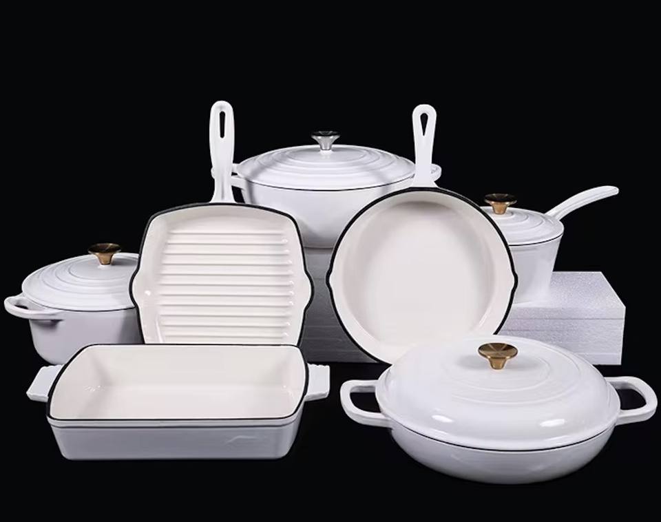 Ensemble de 11 ustensiles de cuisine en fonte émaillée blanc, best-seller : cocotte, marmite à soupe, poêle grill, poêle à frire