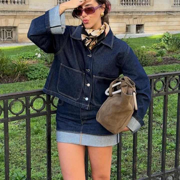 Ensemble de jeans délavés foncés personnalisés, best-seller, veste en jean ample de haute qualité et mini-jupe, ensemble deux pièces pour femmes