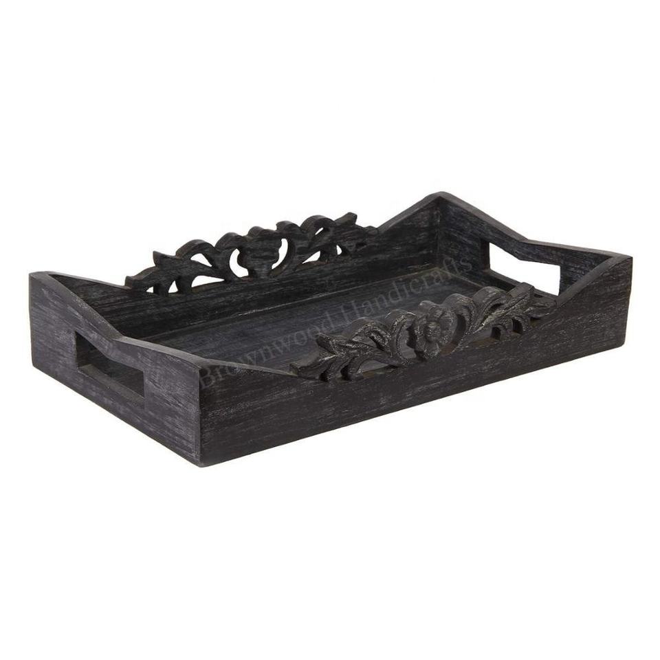 Meilleure vente Plateaux au design personnalisé Forme rectangulaire Plateau de service en bois de manguier massif fait à la main avec poignées Plateaux décoratifs en bois