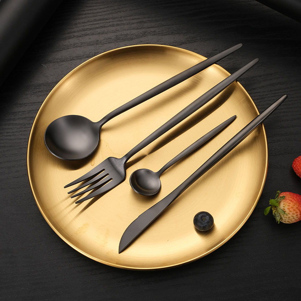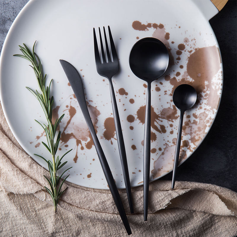 Meilleure vente de couverts en acier inoxydable noir mat personnalisables 5 pièces avec poignée noire pour les hôtels, les cantines et la cuillère incluses