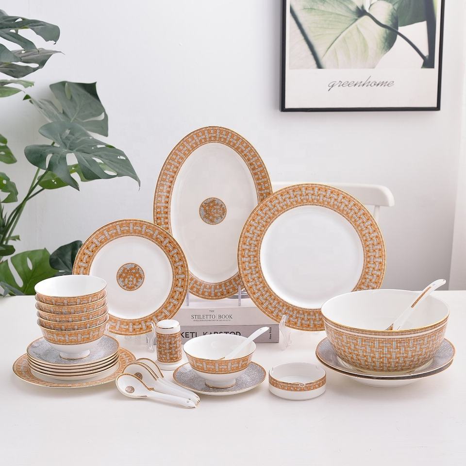 Meilleures ventes de vaisselle en céramique de luxe européenne, 28 pièces, avec bols et assiettes en porcelaine osseuse