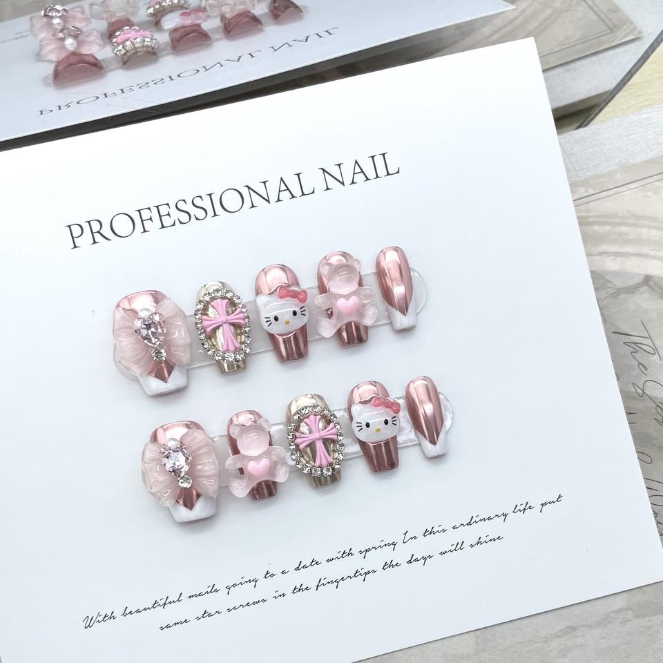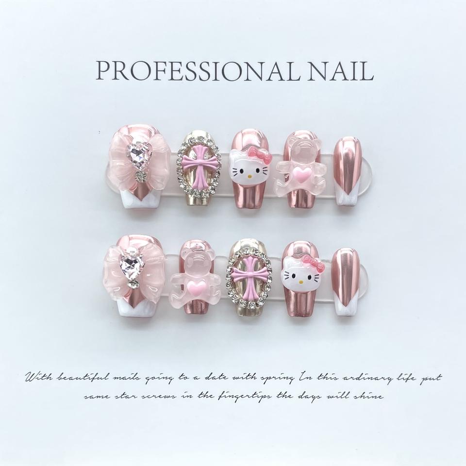Meilleure vente d'ongles artificiels faits à la main dessin animé mignon Hello Kitty Crow coeur croix arc presse sur les ongles
