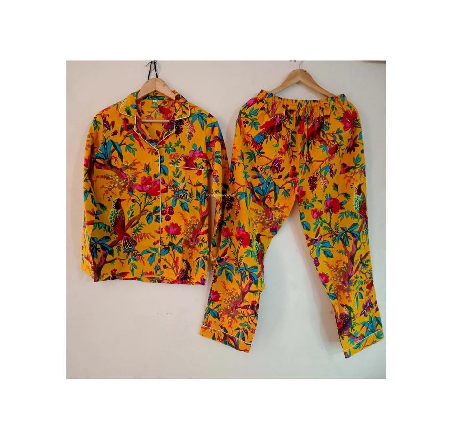 Best Selling Indian Handmade Cotton Pajama Set for Women Floral Bird Printed Sleepwear Dress Blue Nightwear Summer Sexy Features