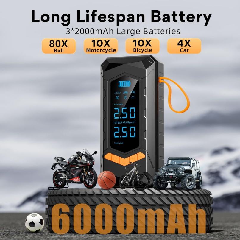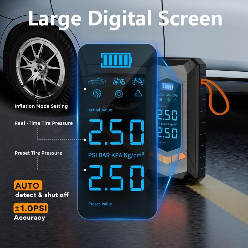 Lumière De secours, Indicateur de puissance, Moniteur de Pression des pneus, Portable, Arrêt automatique, Gonfler rapidementFonction