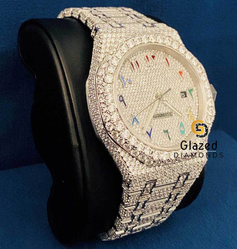 Montre mécanique hip-hop de luxe sur mesure, best-seller, fabriquée en acier inoxydable, cadran arc-en-ciel, diamants cultivés en laboratoire