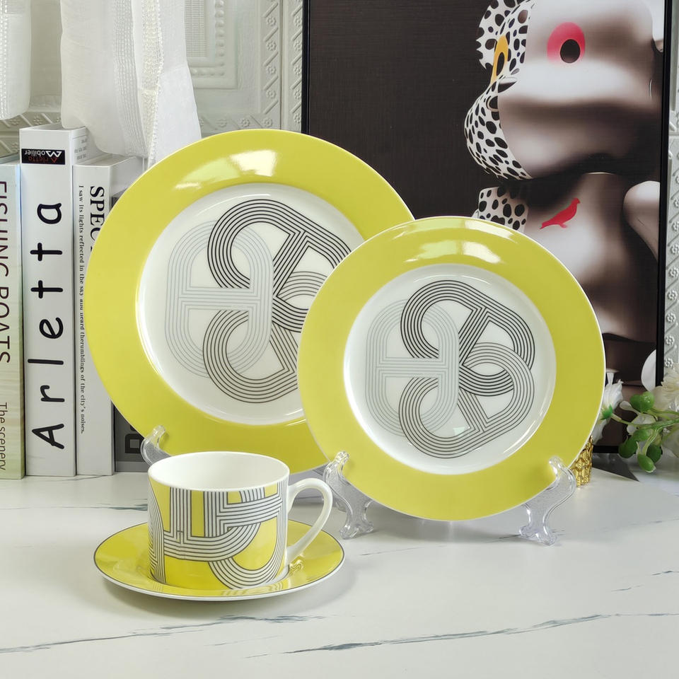 Meilleure vente Ensemble d'assiettes à dîner 2 pièces de luxe de style européen en porcelaine jaune Design moderne en porcelaine pour la maison