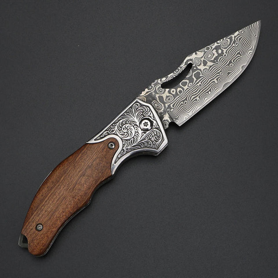 Couteau de chasse pliant à lame droite en acier Damas PRESTIGE BLADES, best-seller, pointe tombante, manche en bois personnalisable, OEM/ODM