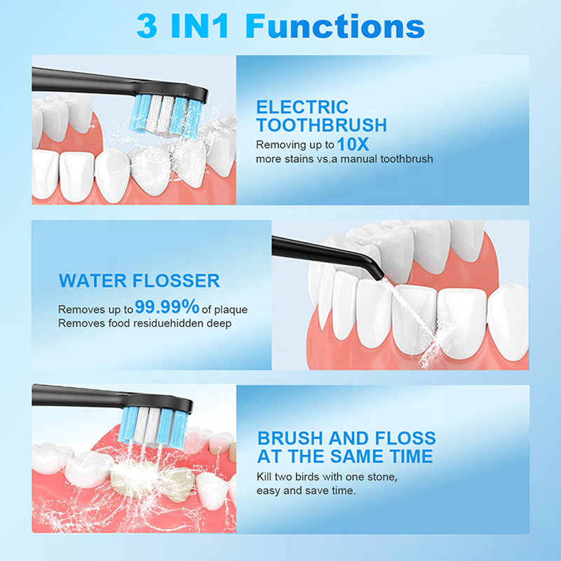 Meilleure vente brosse à dents sonique rechargeable 3-en-1 hydropulseur intégrée 30s quadrant minuterie blanchiment des dents irrigateur oral IPX7