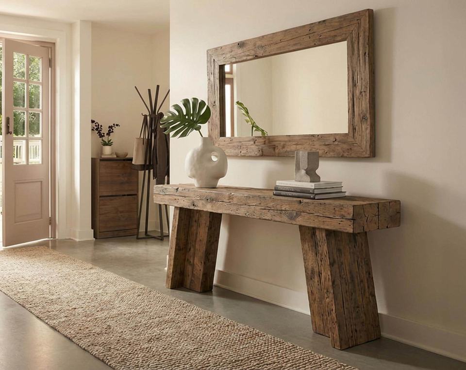 Table console en bois massif recyclé, best-seller, avec plateau en bois massif épais et pieds en blocs inclinés robustes, pour l'ameublement d'entrée.