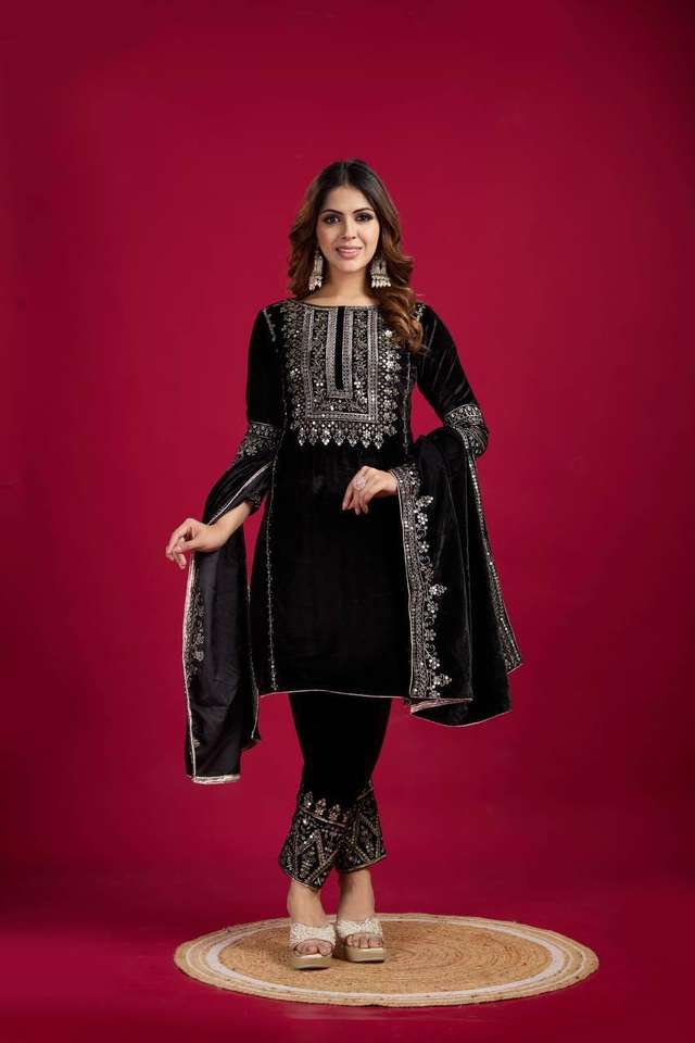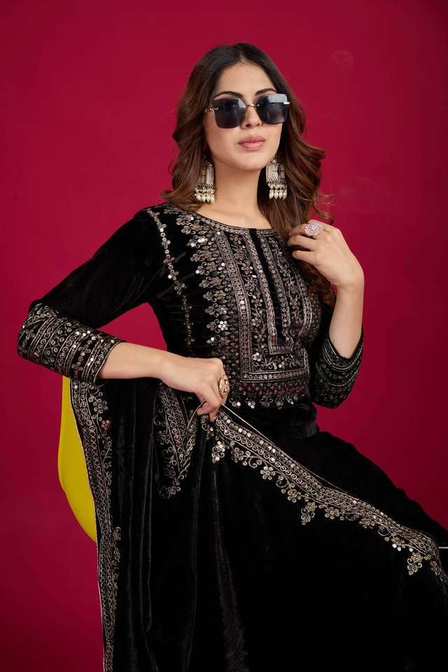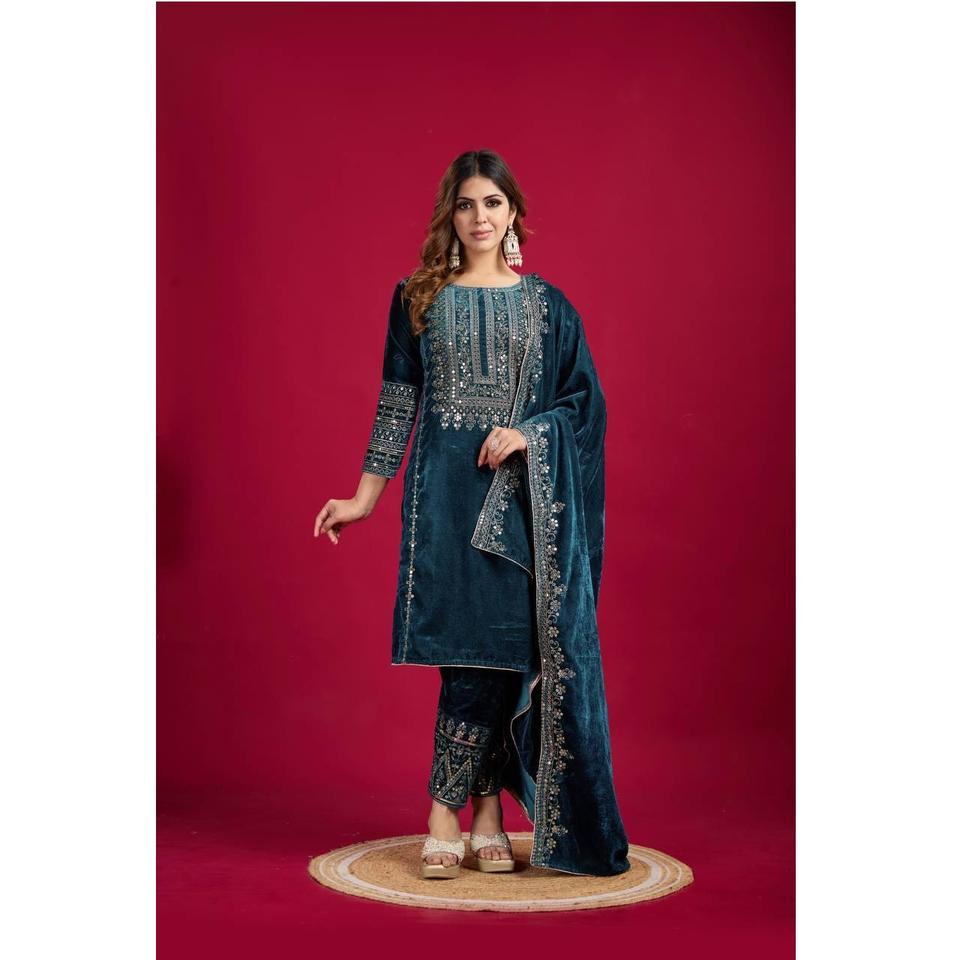 Best Selling Women's Viscose Velvet Long Sequence Embroidery Work Design Wedding/Party Wear Kurti Pant Dupatta Set Maruti