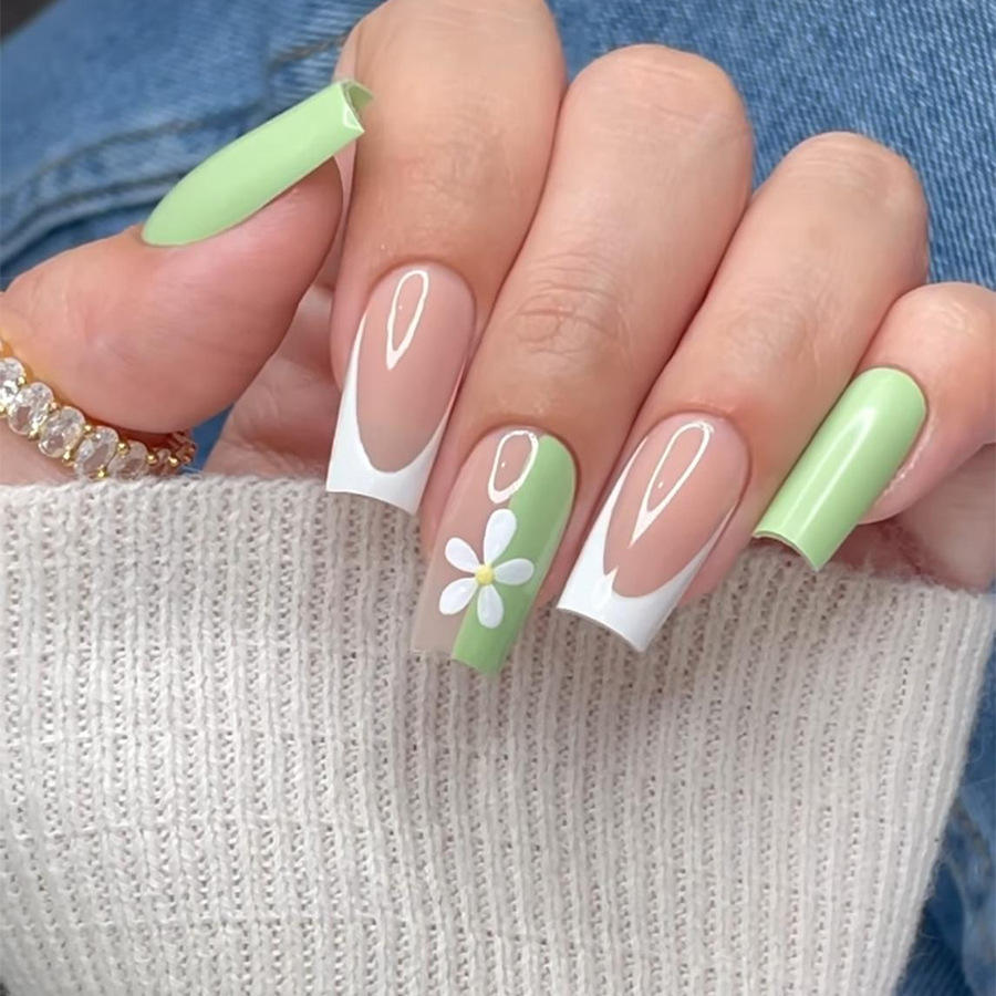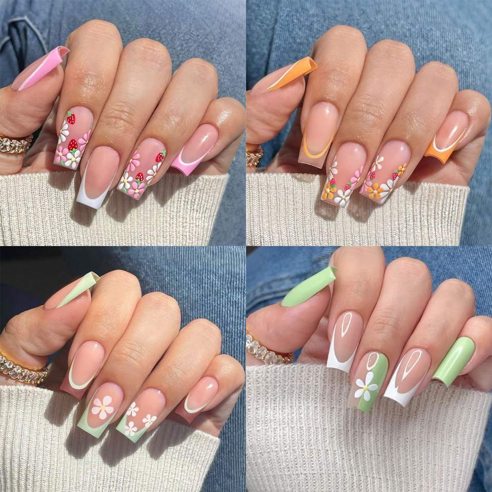 Faux ongles en plastique à couverture complète, style français, à motifs floraux, couleurs estivales, best-seller, certifiés CE, marque personnalisée, réutilisables, avec colle