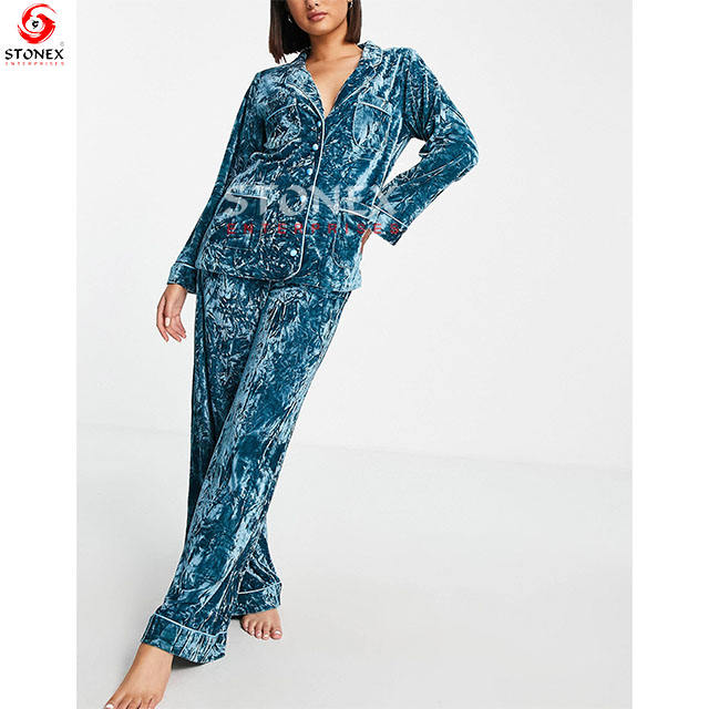 Meilleure vente ensemble de pyjama en velours à simple boutonnage personnalisé de haute qualité bleu vêtements de nuit avec fermeture à la taille élastique