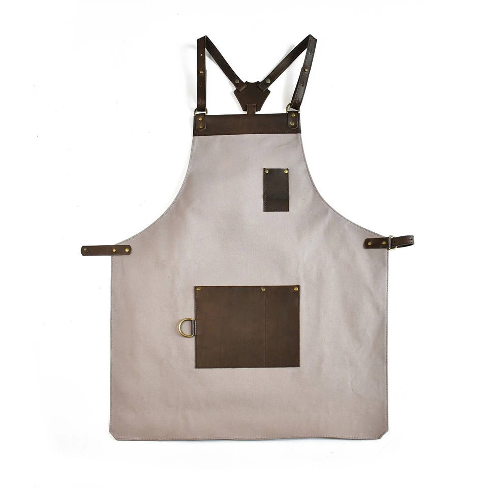 Meilleure vente en gros Tablier de barbier en toile et cuir de haute qualité Tablier de salon de coiffeur croisé avec poches et anneau en métal