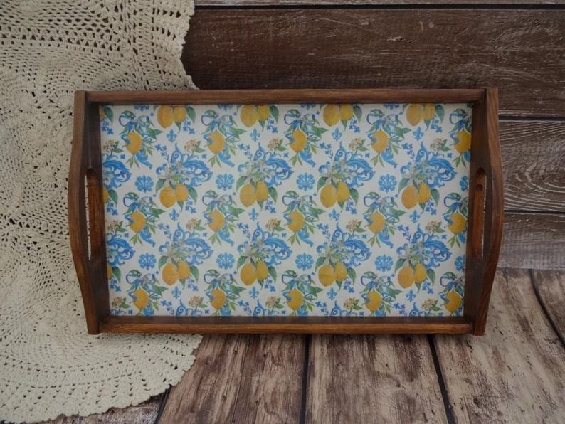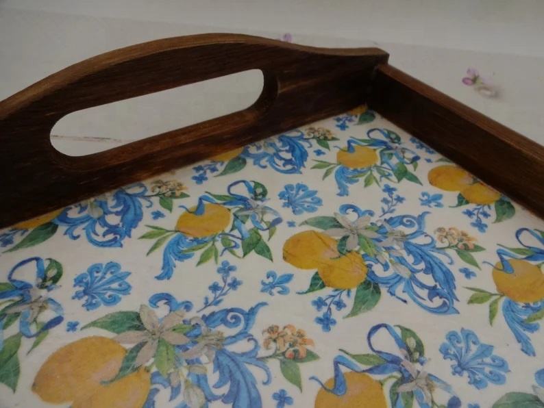 Plateau de service rectangulaire en bois artisanal personnalisable, design imprimé, style rustique, multi-usages, décoratif, avec poignées décoratives