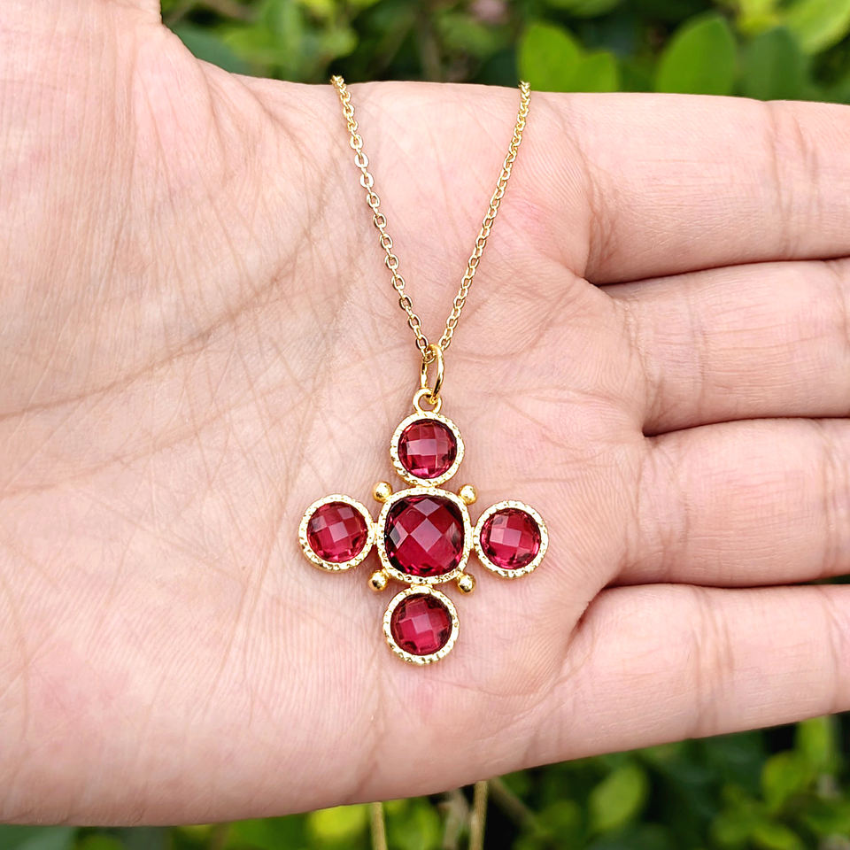 Collier pendentif en quartz rubis à motif croisé, texture laiton plaqué or, chaîne réglable, best-seller