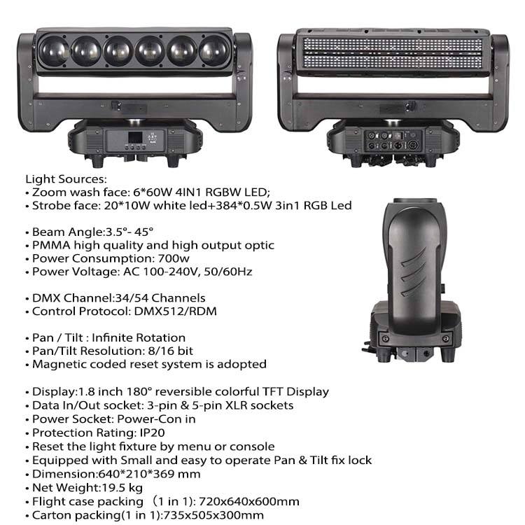 Barre de lumière LED mobile à tête mobile Beyond 660DZ à rotation infinie double face, 6x60W, zoom, pixel bar, DMX512, 6 faisceaux, zoom wash, avec Str