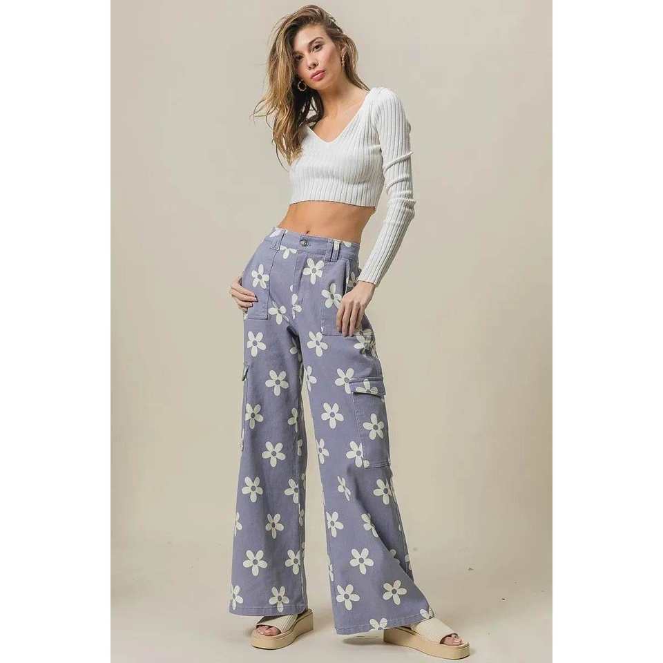 BiBi Pantalon large imprimé de fleurs pour femme avec poche latérale
