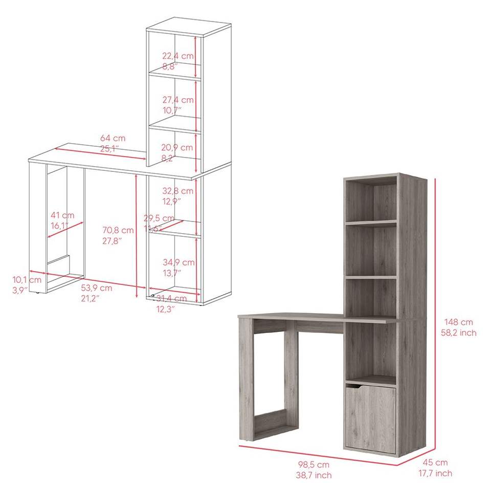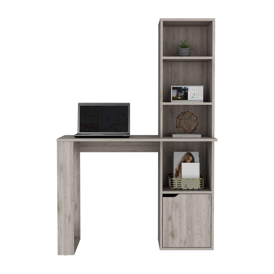 Bureau d'ordinateur Bicknell finition gris clair avec armoire à une porte et étagère à 4 niveaux